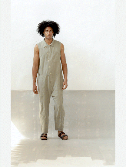 WORKER SLEEVELESS JUMPSUIT IN TEXTURED COTTON WITH AN AGED LOOK